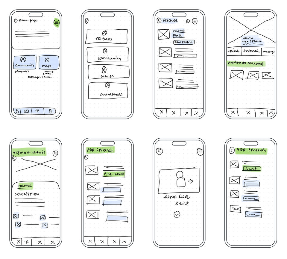 I initiated our project's exploration of user interface solutions by creating low-fidelity prototypes, visualizing the forthcoming digital solution through paper sketches cost-effectively. These initial representations allowed for early testing of ideas, engaging three UX students in an informal interactive session. This collaborative testing approach enabled iterative improvements, solidifying decisions on layout, page content, and navigational flow. The low-fidelity prototype marked a crucial phase, establishing the groundwork for refined design choices and emphasizing a user-centric approach to our project's development.